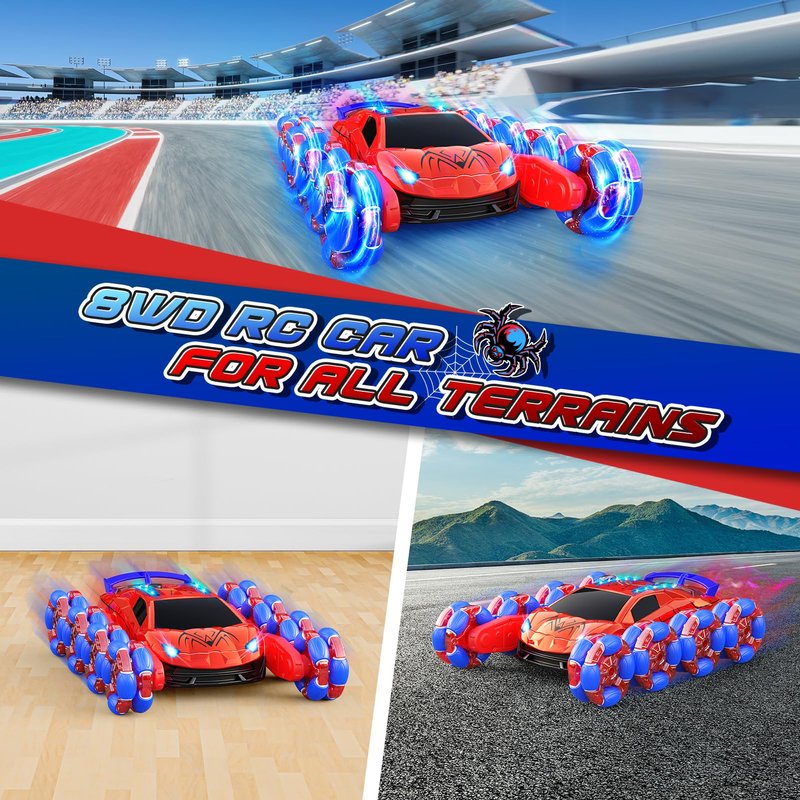 - Spray & Cool Light: Our rc car can spray and light up to look cool. The car wheels can also contort in countless ways. Kids can control the rc car to do any show they want to do, releasing our kid's imagination. And made from high-quality ABS plastic, this rc car is built to last. Its rugged structure is highly resistant to collisions, while its eight wheels and motors provide exceptional power and grip on all types of terrain. Great toys for boys Ages 6-13!
