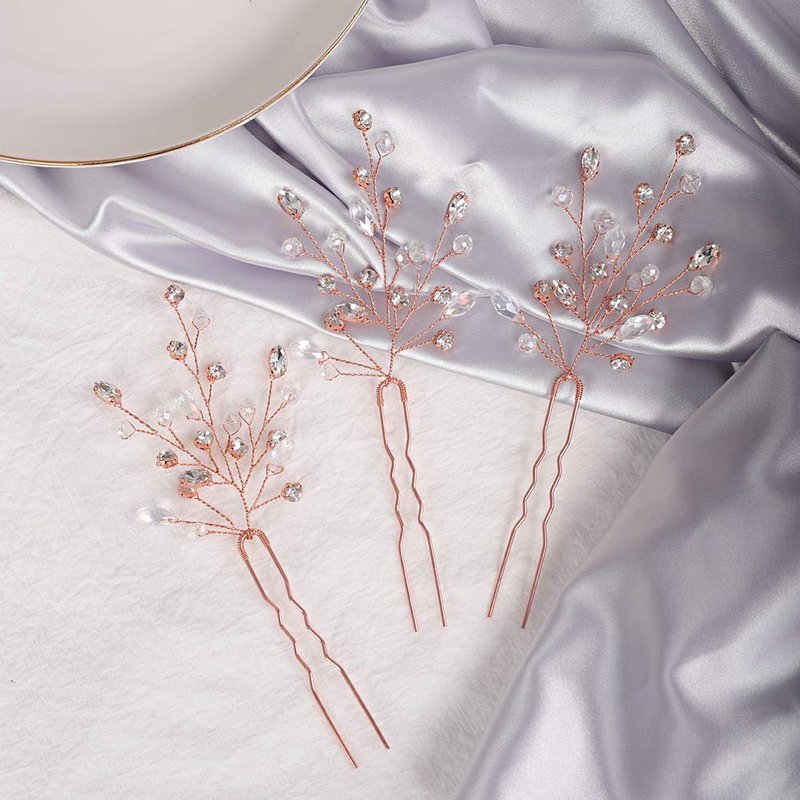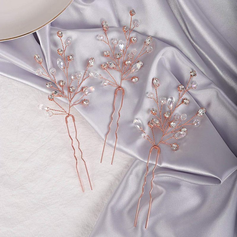 YERTTER 3Pcs Bride Crystal Hair Pins Wedding Hair Pins Decorative Rhinestones Crystal Bridal Bun Clip Accessories for Brides and Bridesmaids (Rose Gold)