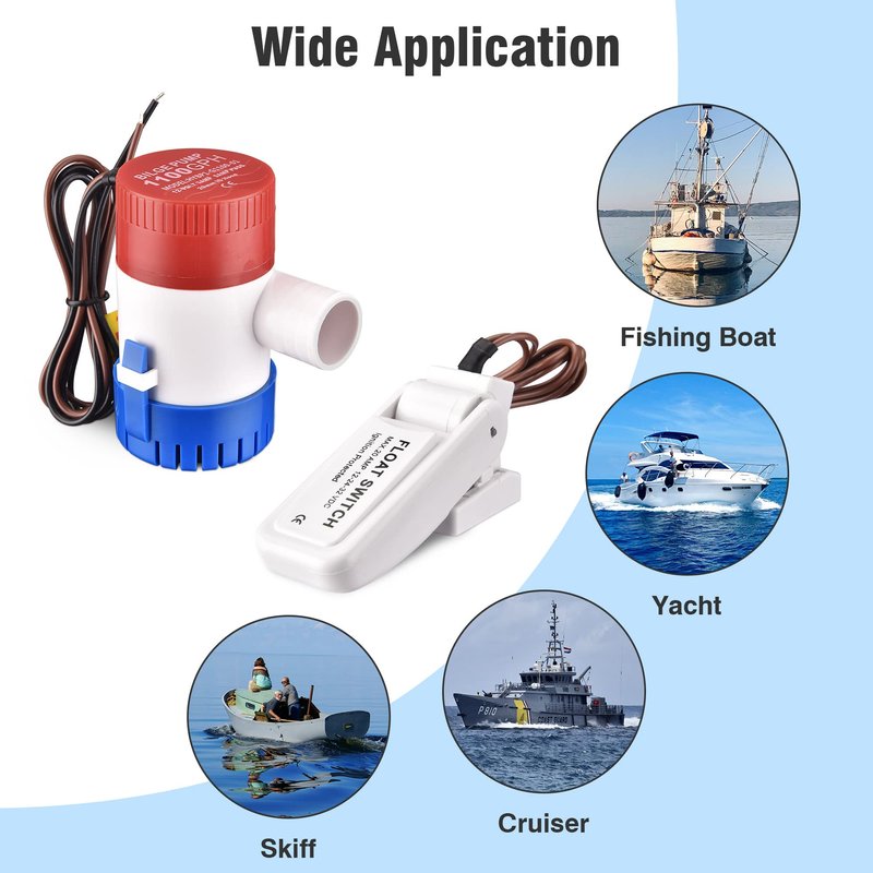 Features: - High Efficiency - 36W Submersible Bilge Water Pump with low noise carbon brush motor provides high flow rate up to 1100 gallons per hour, ideal for providing fast and efficient water pumping to exclude bilge water in cruisers and fishing boats