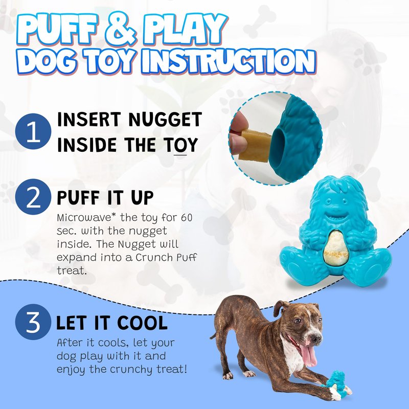 - Puff And Play Dog Toy Instructions: Insert a Yeti Nugget into the cavity, microwave for 60 seconds, and watch the nugget puff up, filling the toy's entirety. Cool it down, and let your dog enjoy the crunchy treat. This puff and play dog toy serves as both a ak nugget holder and an enriching mentally stimulating toy for dogs.