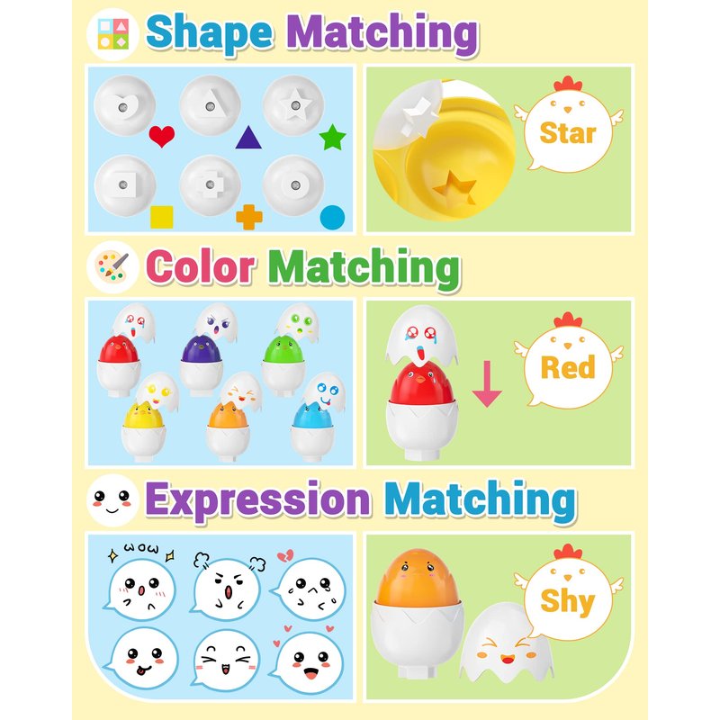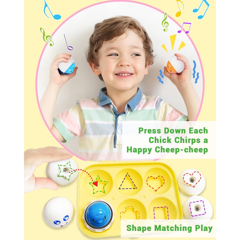 - Multi-purpose Montessori Toys: The Matching Eggs contain 6 colored eggs with 6 different shapes on the bottom, which needs our children put eggs into their own special base by recognizing shapes and colors. It aims at developing kid's minds, practising fine motor skills, improving hand-eye coordination and problem-solving ability. The chicks have 6 facial expressions, including angry, weep, sad, smile, shyness and embarrassment, they will chirp when heads are pressed down gently, so it is a fun way to develop children's sensory and motor abilities.