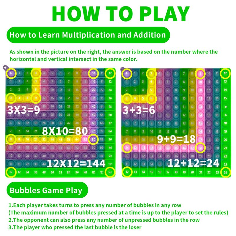 12X12 multiplication chart and 1-12 addition table double-sided printable fingertip bubble math toy and multiplication game challenge toy. Adult decompression toys.Multiplication game addition math toy, this is not only a fun learning 12X12 multiplication and 1-12 addition toys, but also to school teaching can create a variety of interesting learning methods, increase the interaction between students, as a classroom reward or holiday gifts, are very meaningful and surprising. The touch of fingertips and the popping sound produced by pressing the bubble can effectively relieve the anxiety of children and adults and relax.【Function】1.You can learn multiplication, division, addition, subtraction, although the toy surface only printed 1X1-12X12 multiplication and 1-12 addition table, but you can reverse the logic of the method, multiplication can reverse the division, such as 9X9 = 81, 81 ÷ 9 = 9; Similarly, addition can also reverse the subtraction, such as 5 + 5 = 10, 10-5 = 5; as shown in our main picture, according to the arrow instructions then clearly understand how multiplication, division, addition and subtraction are played.2.Suitable for all types of people, also for children with ADHD or ADD and people with OCD or high stress/anxiety levels.3.Suitable for use in schools, teachers can use it as a teaching tool for learning mathematics multiplication, division, addition, subtraction, classroom interactive games to increase the friendship between students and teachers, students and students, but also as a classroom reward for students, so that the classroom learning atmosphere is easy and fun.