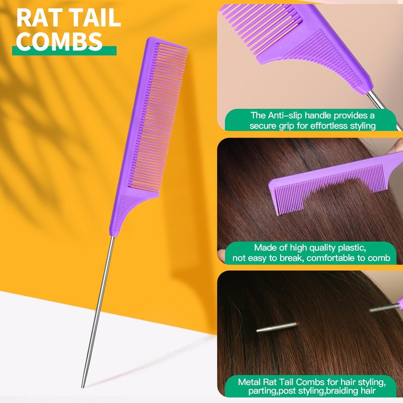 - 1PCS RAT TAIL COMB Rat tail comb have tail and fine teeth designed especially for hair styling. Made of carbon fiber material, the comb are anti-static, heat-resistant, super lightweight, and extremely long-lasting . Meanwhile, the stainless steel pin tail is great for styling, parting, coloring, and back-combing. Overall, the rat tail comb great for different hair types and textures, ideal for sectioning, backcombing and lifting teased hair.