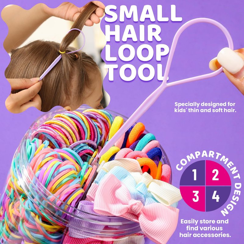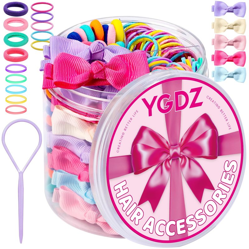 - HAIR ACCESSORIES FOR TODDLERS Looking for personalized hair accessories for kids? YGDZ HAIR ACCESSORIES are perfect girls gifts for any occasion. The set contains 3 different hair ties and 1 hair clips, suitable for various hairstyles. YGDZ hair accessories set includes 300pcs rubber bands for hair , 150pcs small kids hair ties, 100pcs cotton baby hair ties, 10pcs hair clips with bow, 1pcs mini hair loop tool. They are all packed in plastic box with dividers to separates the four types of accessories, perfect for styling little girls’ hair.