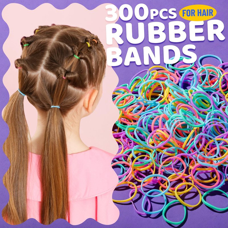 - 300PCS HAIR RUBBER BANDS There are 300 pieces in 5 colors to choose from to suit your wardrobe needs. The elastic hair ties are 30mm long and 0.7mm thick. The high-quality hair ties have an easy-slip coating that allows for easy removal from the hair. A small small topsy tail hair tool designed for children's thin, soft hair is included. The hair loop tool is great for braiding and styling, and can easily pull hair for unique and creative looks.