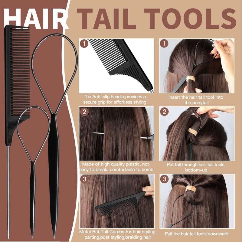 - HAIR ACCESSORIES FOR WOMEN The hair loop styling tools as good helper for your daily hairstyles, won’t take much your time, only a few seconds, a pretty hairstyle, such as a bouffant ponytail, a nice bun, braid, bob cut and so, easily done! With a tail and fine tooth design, the rat tail combs is an essential tool for every woman’s hair care routine, suitable for professional and home use.
