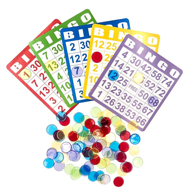 - Included: This complete bingo set has everything you need to play bingo game. Each bingo set includes 100 Bingo Cards in five colors, and 1000 Colorful Transparent Bingo Chips.