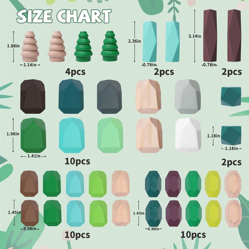 - 40 PCS Wooden Stacking Stone Toys: The set of stacking rocks building blocks for kids comes with 40 pieces in different sizes, shapes and colors, making the building game more attractive and challenging. The stacking blocks are perfect sensory toys for toddlers 3-5