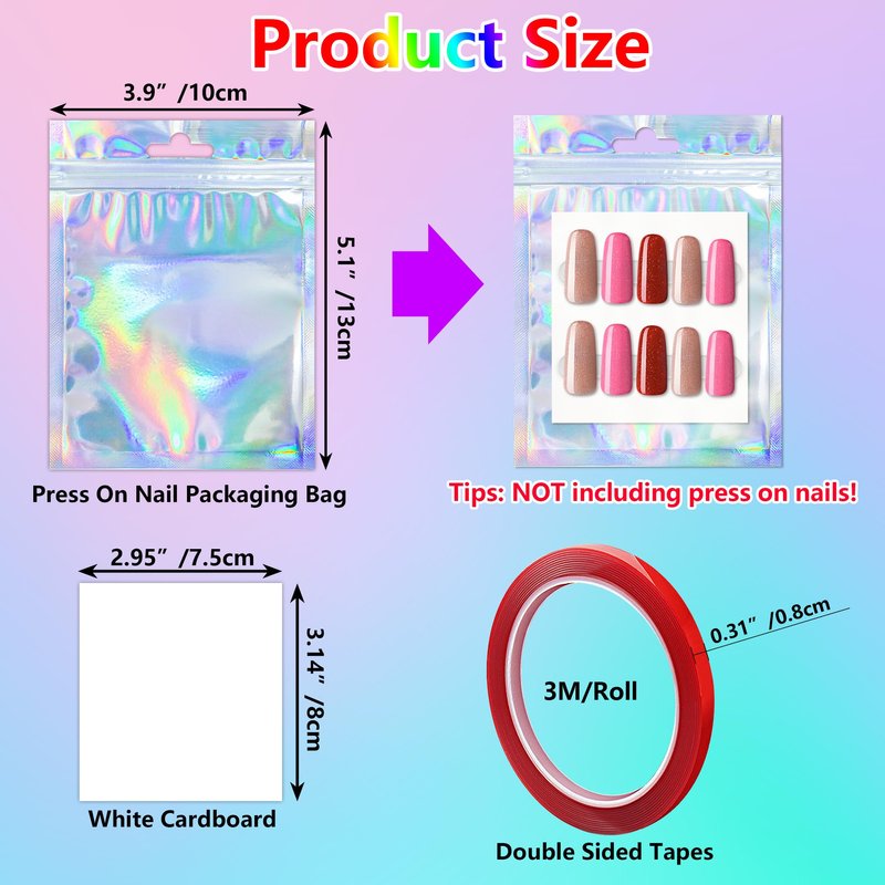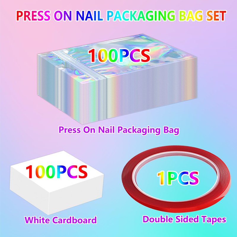 YHNTGB 100 Pack Empty Press on Nail Packaging Nail Cases for Press ons Press on Packaging Including 100 PCS Holographic Bags and 100 PCS White Card with Transparent Tape for Press on Nail Business