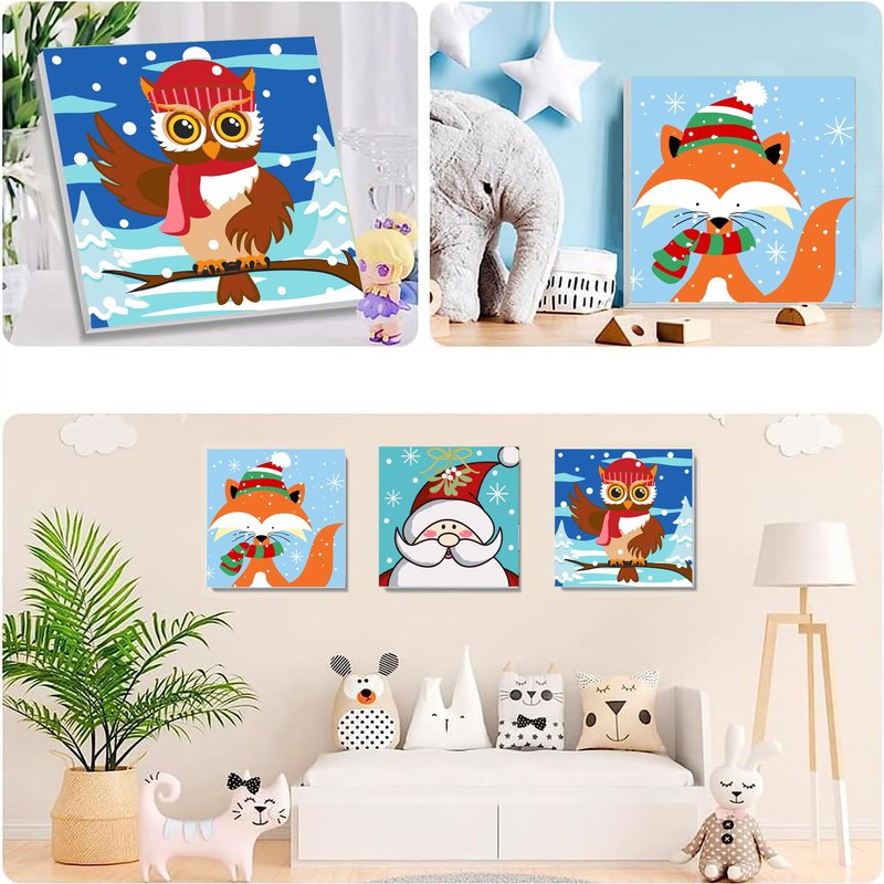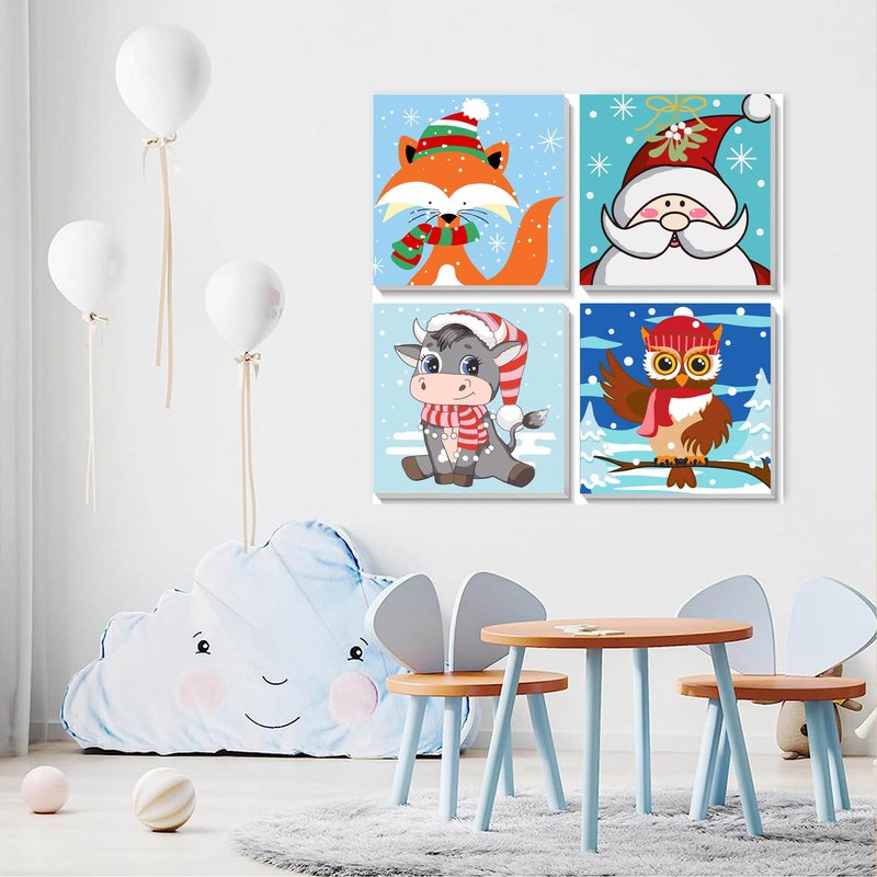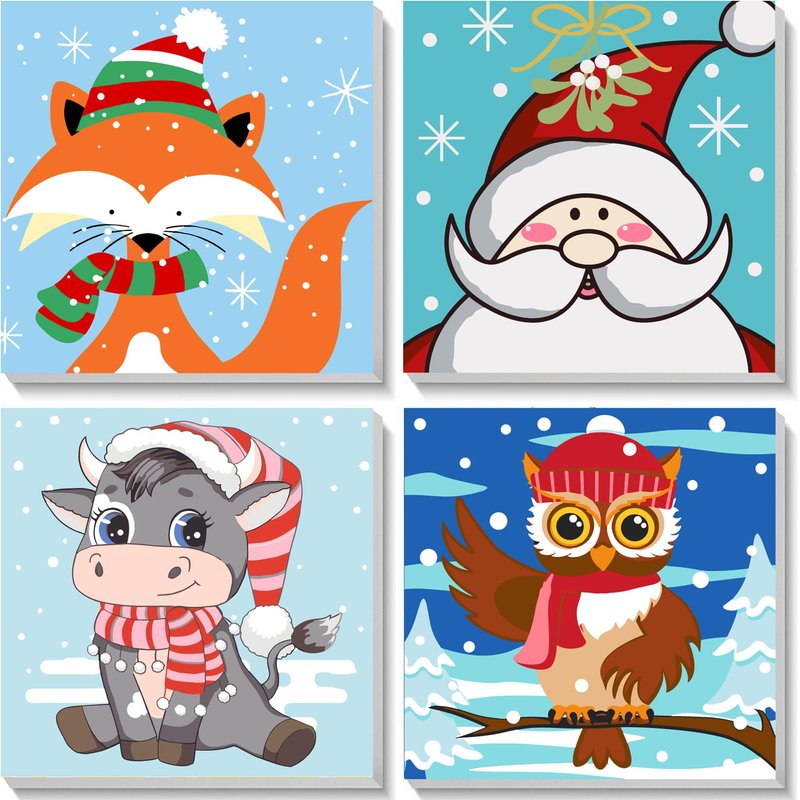 4 Pack Christmas Paint by Number for Kids Ages 4-8,Cute Animals Easy Acrylic Paint by Number for Kids On Canvas,Oil Painting Paint by Number Kits Present for Kids(Framed)