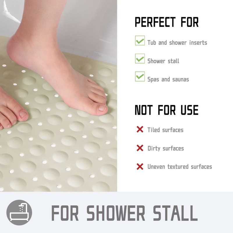 - 【Warning】 Prevent Falls: Secure suction cups before each use. Mat will only attach to clean, smooth shower stall surface. Not for use on textured, tiled, or non-smooth shower stall surfaces. Do not use bath oils and jump on the shower mat– may cause slipping