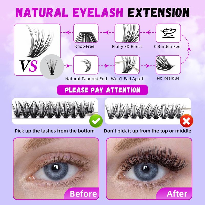 - 【Eyelash Kit At Home】:The Yinaber DIY Eyelash Extension Kit allows you to create a fresh new style anytime, anywhere. Remember, even a slight change can make a significant difference. The convenience of this cluster eyelash extension kit means you can achieve your own beauty at home, without having to visit a salon. This saves you both money and time on makeup.