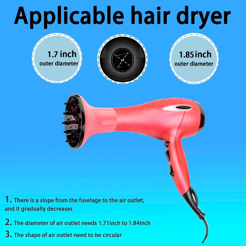 - 😊【Real Universal Hair Diffuser】: This Universal diffuser use a new rotary design with lock button, can be adjusted and fits for hair dryer with nozzle diameter of1.7inch - 1.85 inch. It can adapt to more than 95% different designs of hair dryer in the market and easy to use.