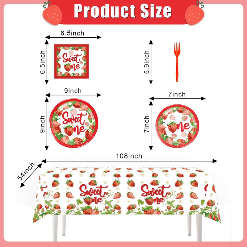 - Package contents: You will receive 1 berry first birthday party supplies banner,8 hanging swirls, 1 strawberry birthday decorations 1st tablecloth(54×108in), 20 strawberry plates(7in and 9in ), 40 strawberry napkins, 20 strawberry theme 1st birthday decorations paper cups, forks, and straws