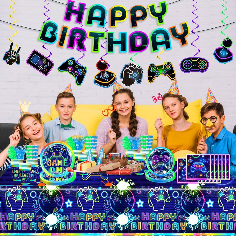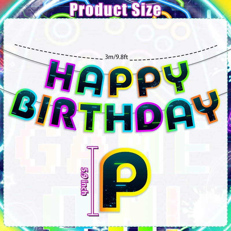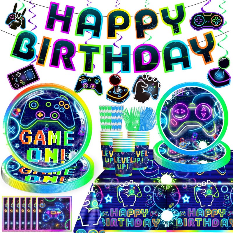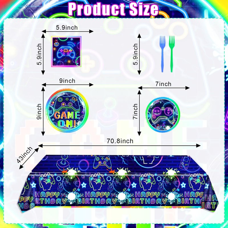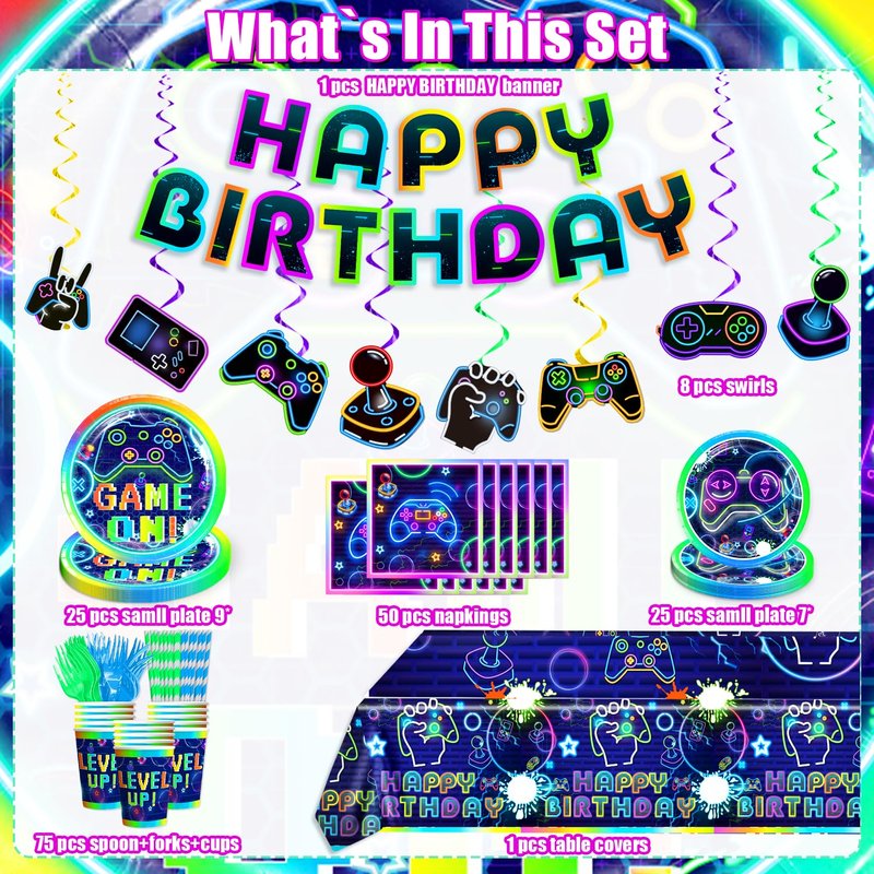 - 【package includes】: gamer birthday party decorations tableware set includes 25pc 9" disposable skating plates, 25 pc 7"disposable plates, 25 pc straws, 25 pc paper cups, 25 forks, 25 pcs gamer theme napkins, 1pc happy birthday banner, 8pc hanging swirls, 8pc hanging cards,1pc tablecloth. this video game birthday decorations tableware set will make your all-star boy’s girl's birthday decoration party funnier.