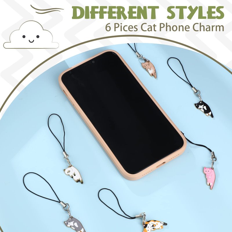 Yinkin 6 Pieces Cat Charm for Mobile Phone, Kawaii Charms Strap, Cute Hanging Cat for Backpack, Wallet, Keychain Pendant