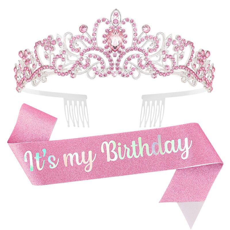 PRODUCT: Pink Birthday Girl Sash & Crown Gold Princess Tiara Crown for Women Girls Happy Birthday Queen Crown & Sash Birthday Tiaras & Crowns for Women Crystal Birthday Headband Birthday Party Decorations