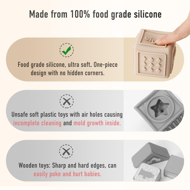- Safe Material: Made from 100% food-grade silicone, our silicone blocks are free from BPA, PVC, and phthalates. Unlike plastic and wooden materials, silicone is very soft, making it perfect for babies to grasp and chew on without parents worrying about their child getting hurt.