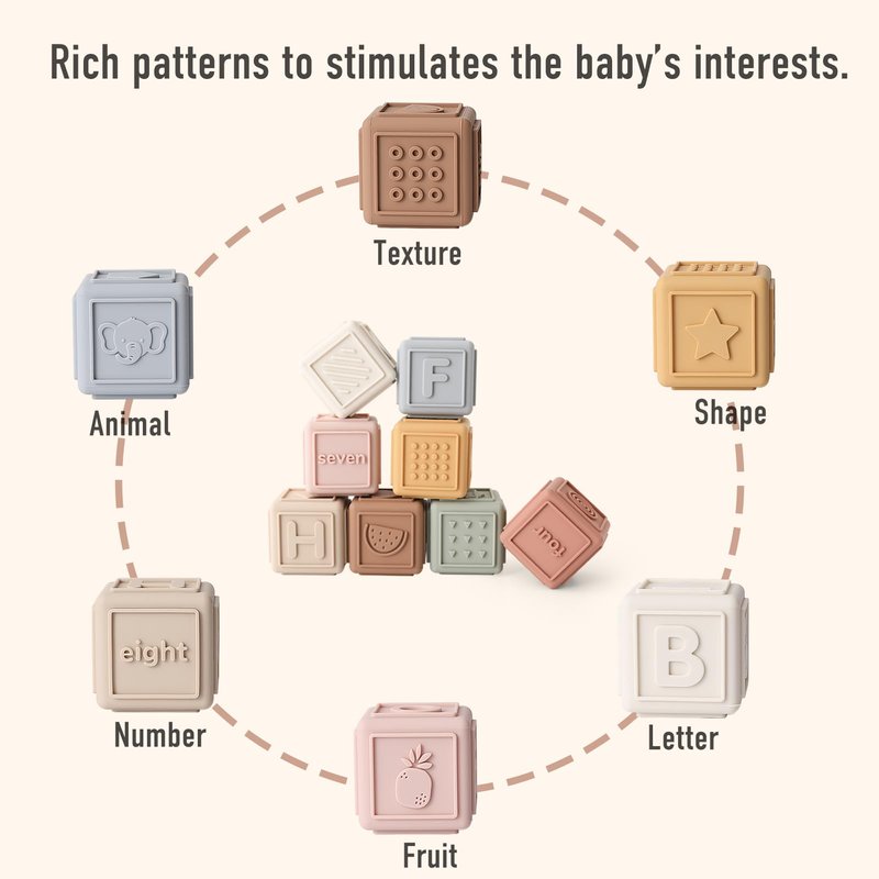 - Early Educational Toy: These silicone blocks are ideal for teething babies, offering safe materials and textured surfaces for soothing relief. They encourage counting, visual and tactile skills, logical thinking, and enhance fine motor skills and creativity.