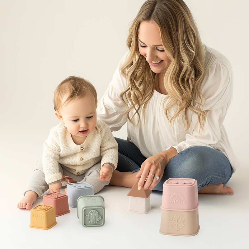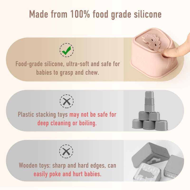 - Safe Material: Made from 100% food-grade silicone, our baby stacking cups are free from BPA, PVC, and phthalates. Unlike plastic and wooden materials, silicone is very soft, perfect for babies to grasp and chew on, and parents don’t need to worry about your child getting hurt.
