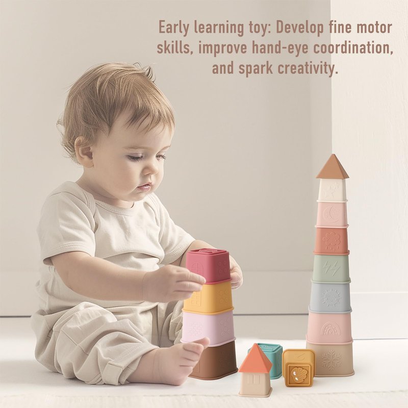 - Versatile Teething Toy: The soft silicone material with textures makes these baby stacking tower perfect for teething babies, helping to soothe teething discomfort. Easy to clean, they are boilable and dishwasher safe.