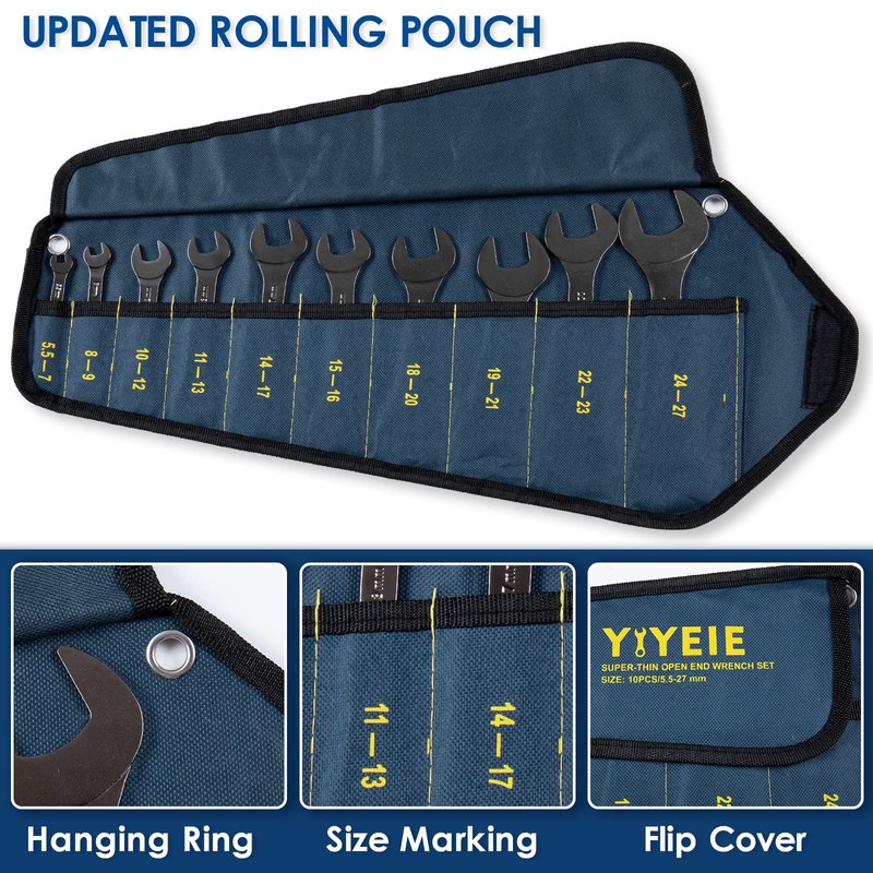 YIYEIE Super-Thin Open End Wrench Set, 10-Piece Metric, 5.5, 7, 8, 9, 10, 11, 12, 13, 14, 15, 16, 17, 18, 19, 20, 21, 22, 23, 24, 27 mm, Nickel Coating, CR-V Steel, Slim Wrench with Rolling Pouch