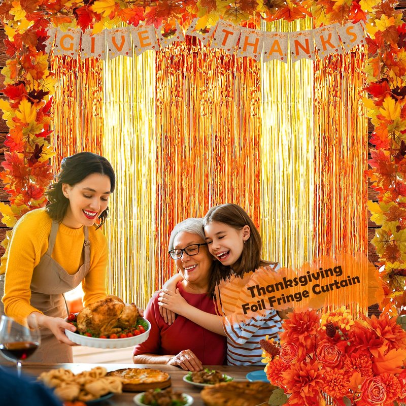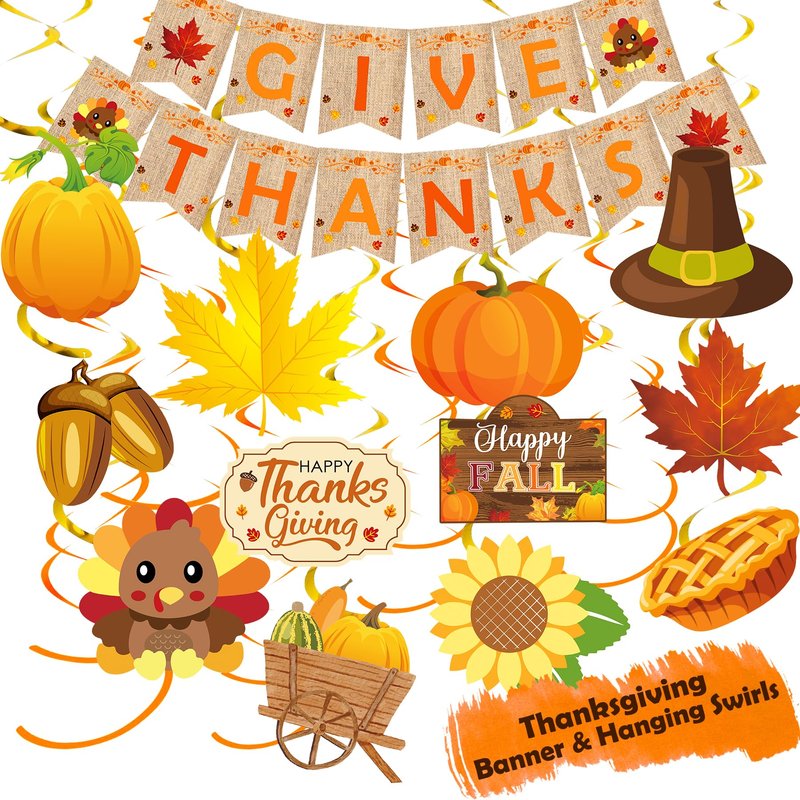 - All-in-one Thanksgiving Party Decorations Set - Package Includes: Give Thanks banner, 10pcs Thanksgiving paper fan decorations, 20pcs Thanksgiving hanging swirls, 2pcs foil fringe curtains, 2pcs door porch banner, 50pcs fall maple leaves, 104pcs