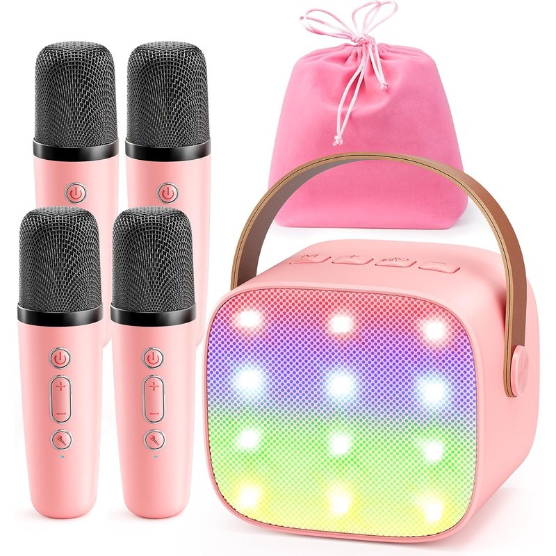 YLL Mini Karaoke Machine for Kids Adults: Portable Loud Speaker with 4 Wireless Microphones - Christmas Birthday Party Gifts for Girls 3,4,5,6,7,8+ Year Old Toys(Pink-4 Mics)