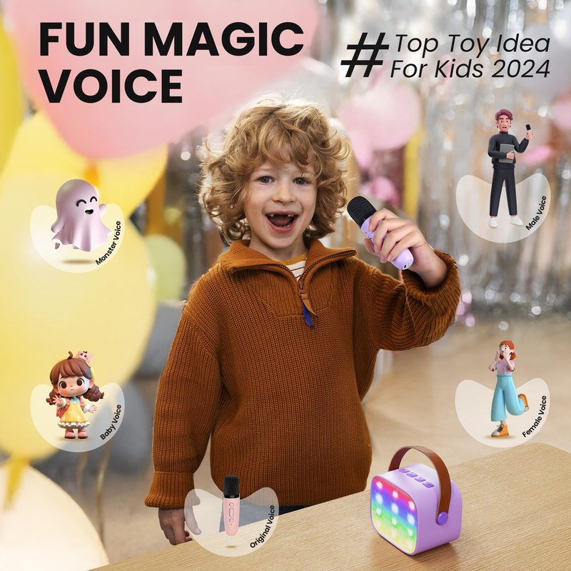 - Multi function Karaoke Machine: Come with 4 kinds of magic voices, fun and interesting for kids toys. The colorful lights creates a fun atmosphere. Headphone output on back. Perfect for singing practice, home family karaoke, small enough to bring when you travel