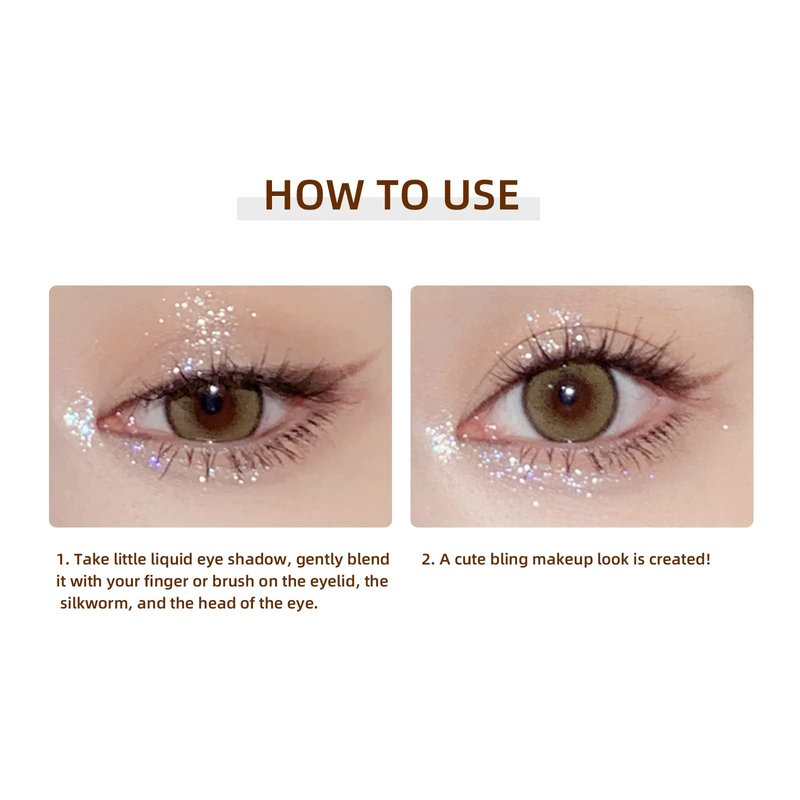 - Easy to Apply and Easy to Remove: You can apply little liquid eyeshadow on the belly of your finger or with the brush and apply it on the top of the eyeliner, on the silkworm, or other places that need to be make up; You will easy to remove the glitters with cosmetic pads or wipes.