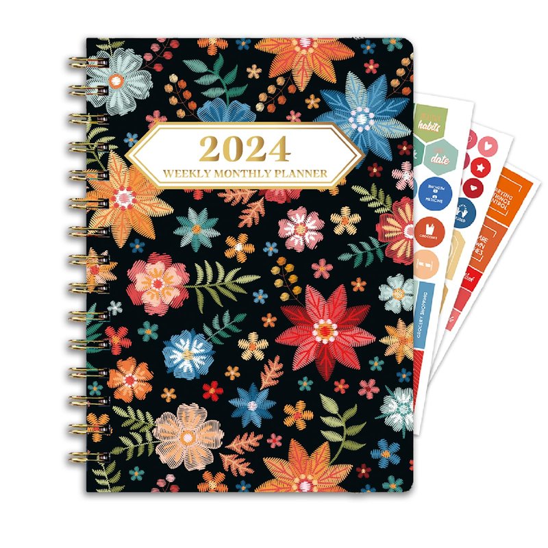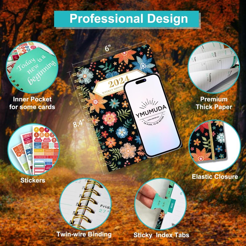 Ymumuda 2024 Planner, 12-Month Weekly Monthly Planner from JAN.2024 to DEC.2024, 8.4" X 6", Spiral Planner Notebook with Stickers, Elastic Closure, Inner Pocket, Sticky Index Tabs, Floral 01