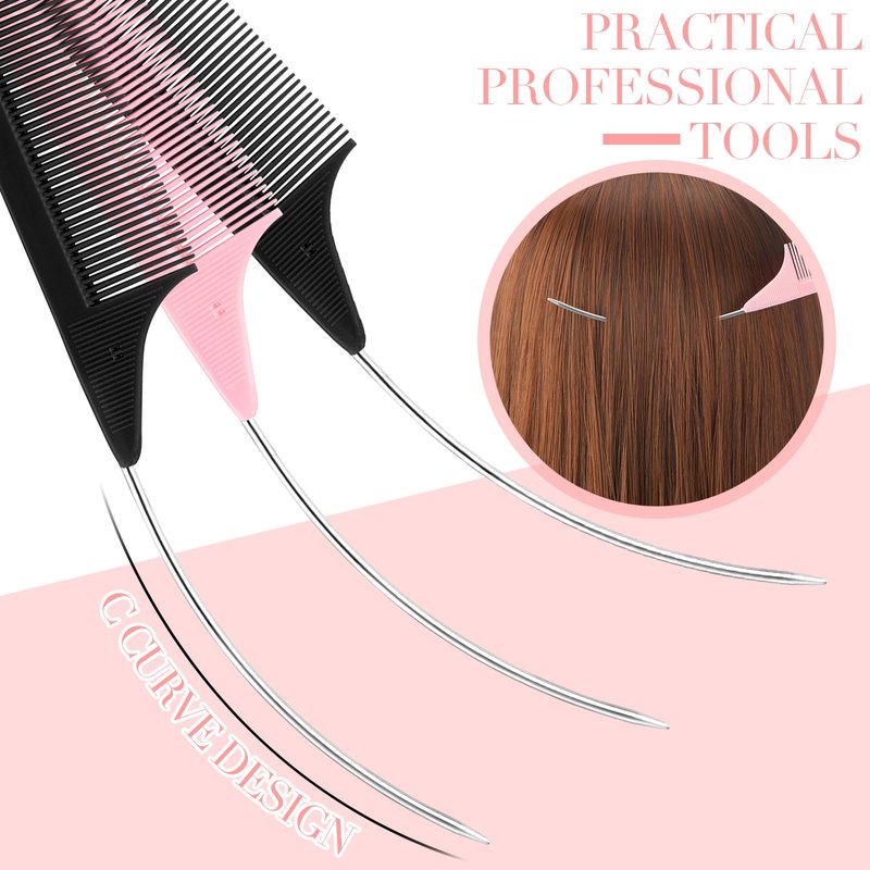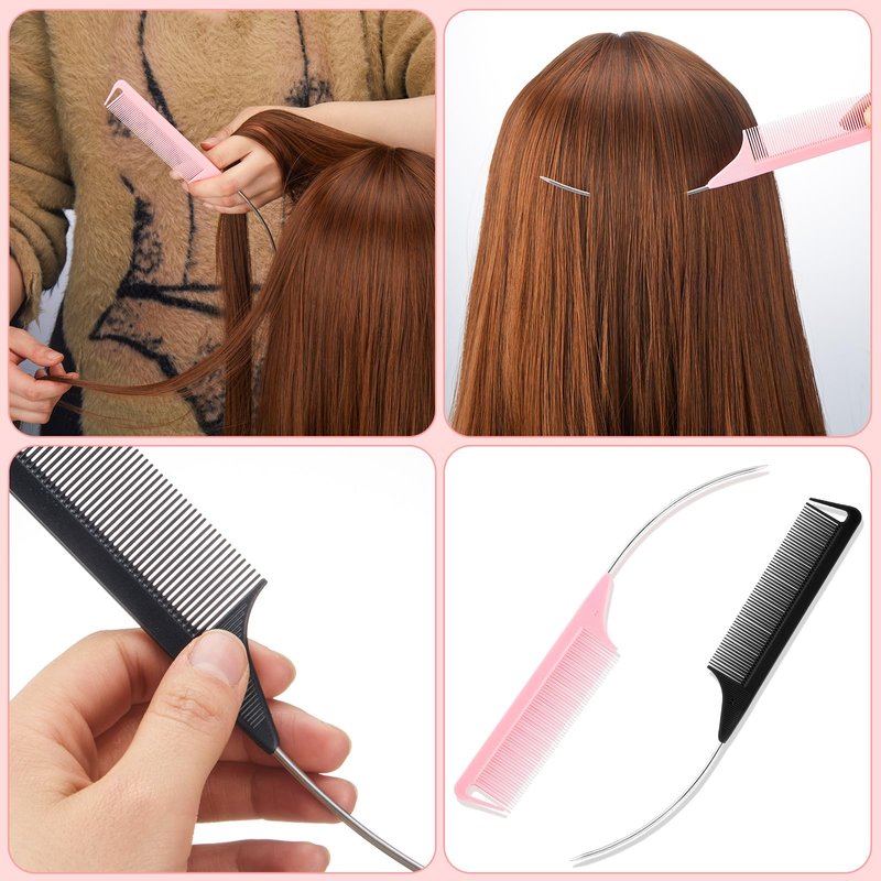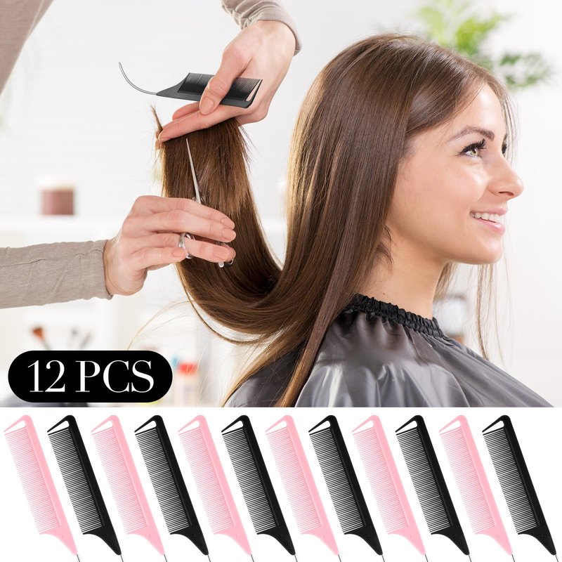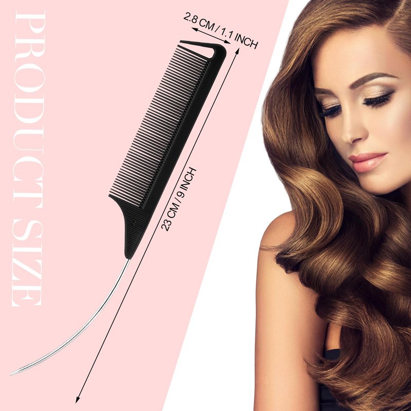 Features: Stylish color selection: Our set comes with rat tail combs for parting in 2 attractive colors, black and pink, with 6 pieces of each color. The color variety allows you to switch between combs and adds a fun element to your hairstyling tools collection. Suitable size: Measuring about 9.25 x 1.1 inches/ 23.5 x 2.8 cm, our hair styling combs are the ideal size for handheld use. Their practical design facilitates a comfortable grip and provides better control when untangling hair or creating intricate hairstyles. Their size is ideal for both professional stylists and those who enjoy DIY hairstyling at homeSpecifications: Material: stainless steel, carbon fiber, nylonSize: about 9.25 x 1.1 inches/ 23.5 x 2.8 cmColor: 2 colors, black, pink (6 pieces for each color)Package includes: 12 x C curved rat tail combsNotes: Manual measurement, please allow slight errors on size. The color may exist a slight difference due to different screen displays. Pointed items included, please keep away from little kids.