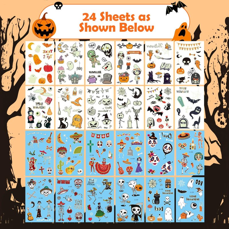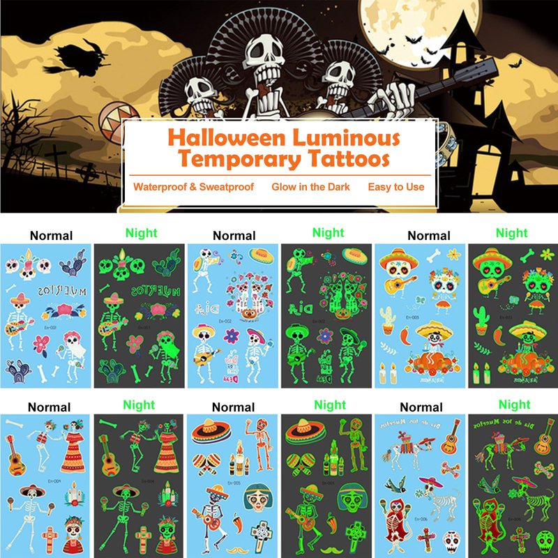 - Glow Halloween Party Supplies for Kids: Luminous, glow-in-the-dark designs that let you shine even in a crowd of friends at parties! Our Yobbai temporary tattoos feature spooky ghosts, flying bats, and playful jack-o'-lanterns (or pumpkins) that kids adore. A beautifully curated set of tattoos adds an extra thrill to the trick-or-treating fun