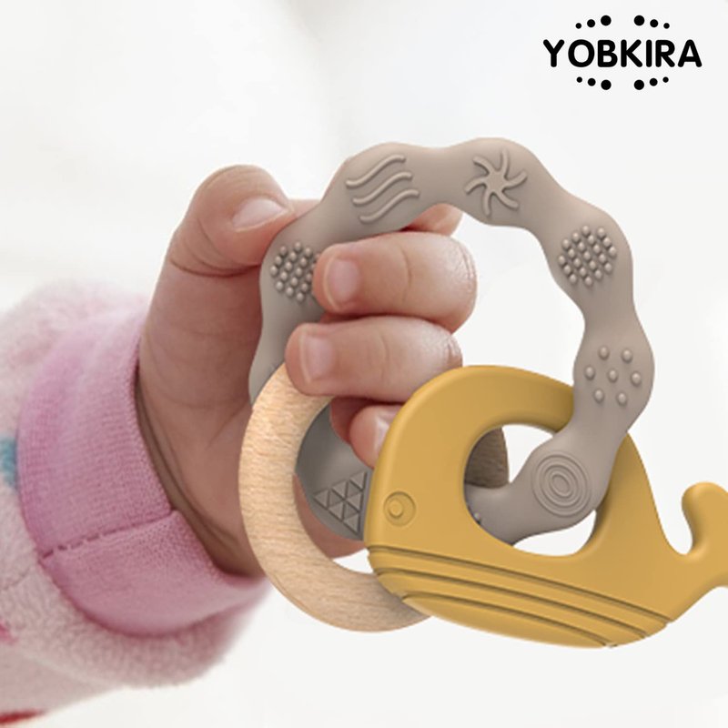 Yobkira Natural Wood & Silicone Teether Ring with Gift Package,Baby Teething Toys Best for Babies 3 Months UP,Cute Whale,100% Food-Grade Silicone (Yellow)