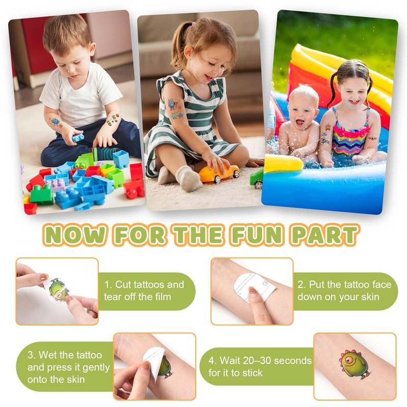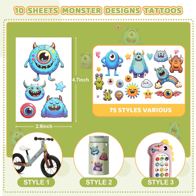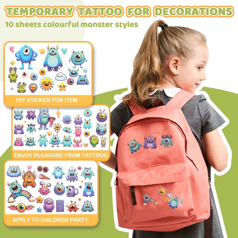 - 🪐 FUN TATTOOS STYLES: Our kids tattoos temporary bring creativity to any themed party or daily activities. Let your kids express themselves with these colorful monster stickers, whether they're dressing up for a monster party or simply adding a touch of fun to their day-to-day activities, adding a fun touch to their day while they enjoy their favorite temporary tattoo designs!
