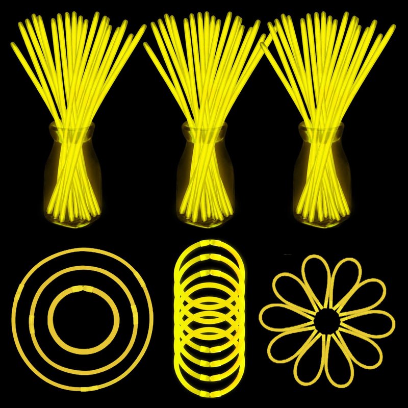 - Glow in the Dark Party Supplies:You will get 150pcs yellow glow sticks and 150pcs connectors,enough quantities to share with your friends to make glowing bracelets or necklace in Hawii carnival,birthday,pool party,wedding,4th of July,Halloween,Christmas,New Year and so on.These glowing sticks will add more fun to your party and light up party atmosphere. Contact us if you meet any problem with the sticks,100% after sales-service will be offered