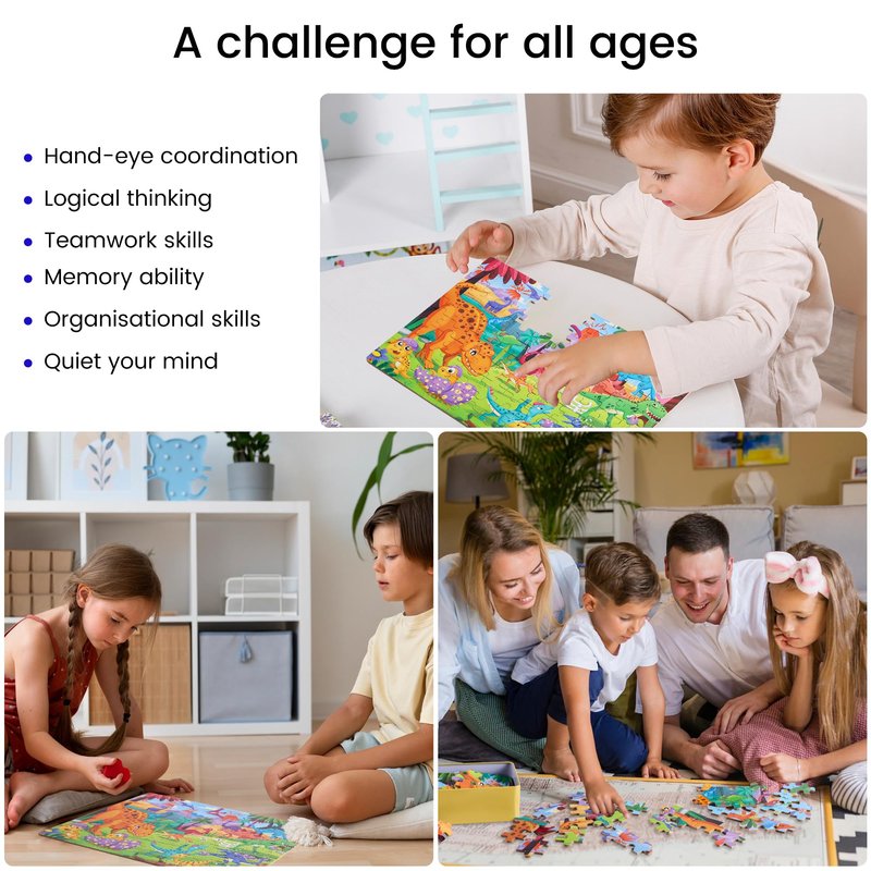 - HELPS DEVELOP SKILLS: Dinosaur-themed puzzle helps kids develop multiple skills such as hand-eye coordination,concentration and creativity, problem solving, and knowledge of our planet’s history.