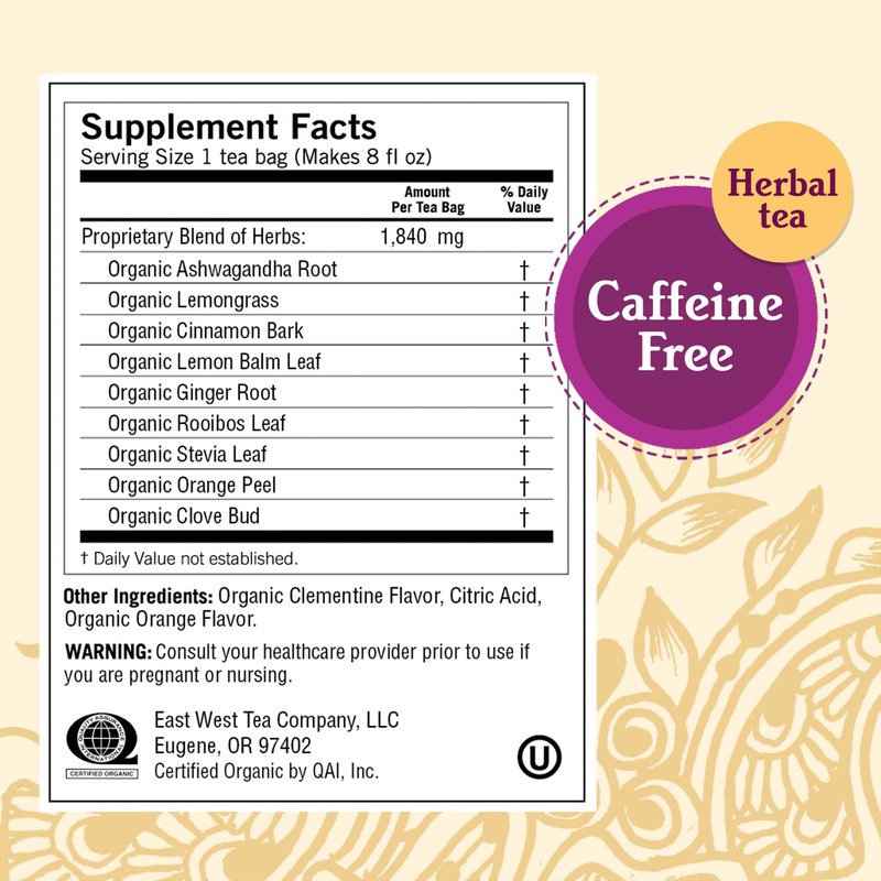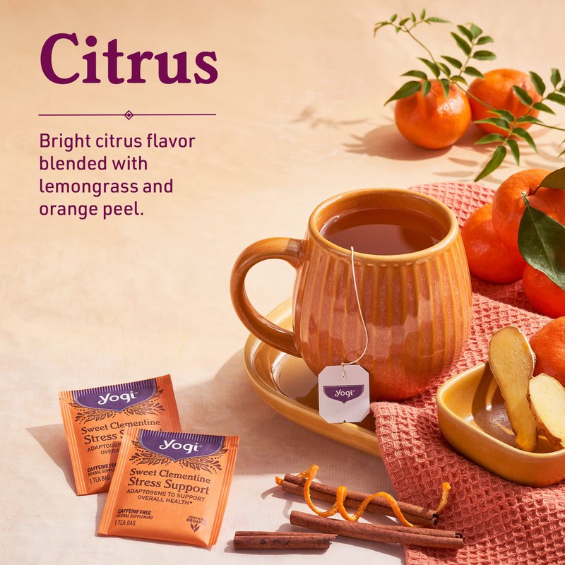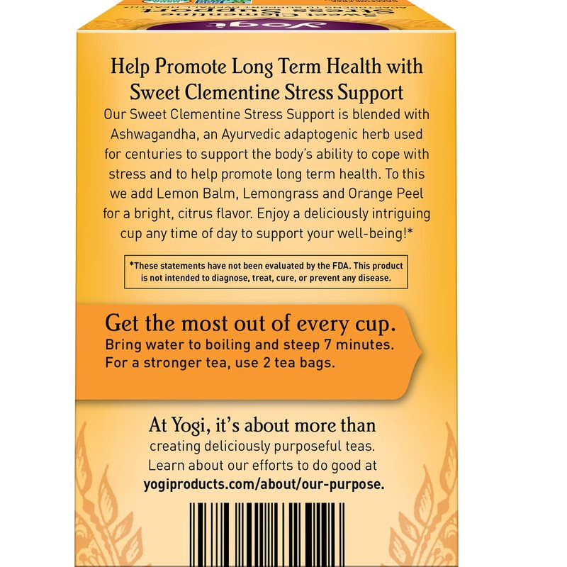 - Stress Support Herbal Tea: Yogi Sweet Clementine Stress Support tea is purposefully blended with Ashwagandha, an Ayurvedic adaptogenic herb used for centuries to support the body’s ability to cope with stress