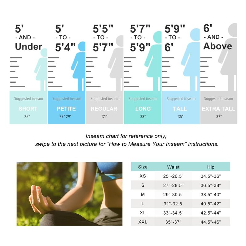 - Short (25" inseam) fits women under 5'. Petite (27"/29" inseam) fits women 5'-5'4". Regular (31" inseam) fits women 5'5"-5'7". Long (33" inseam) fits women 5'7"-5'9". Tall (35" inseam) fits women 5'9"-6'. Extra Tall (37" inseam) fits women 6' and above. Note: This inseam chart is for reference only. To ensure the best personal fit, refer to our "How to Measure the Inseam" section in the product description to find your ideal inseam length