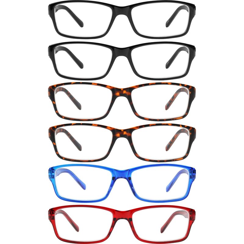 - FASHIONABLE STARTER SET of unisex clear reading glasses includes 2 Black frame readers, 2 Brown Havana frame readers, 1 pair of red frame readers and 1 pair of blue frame readers