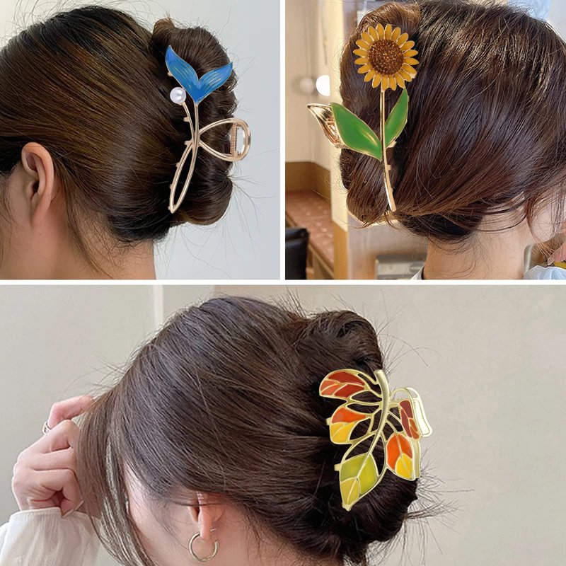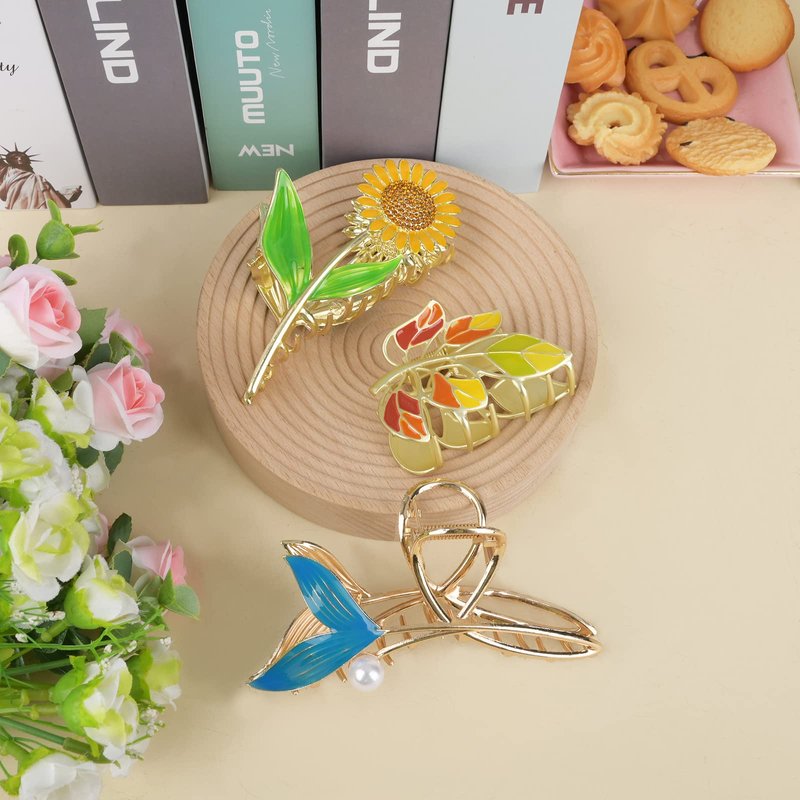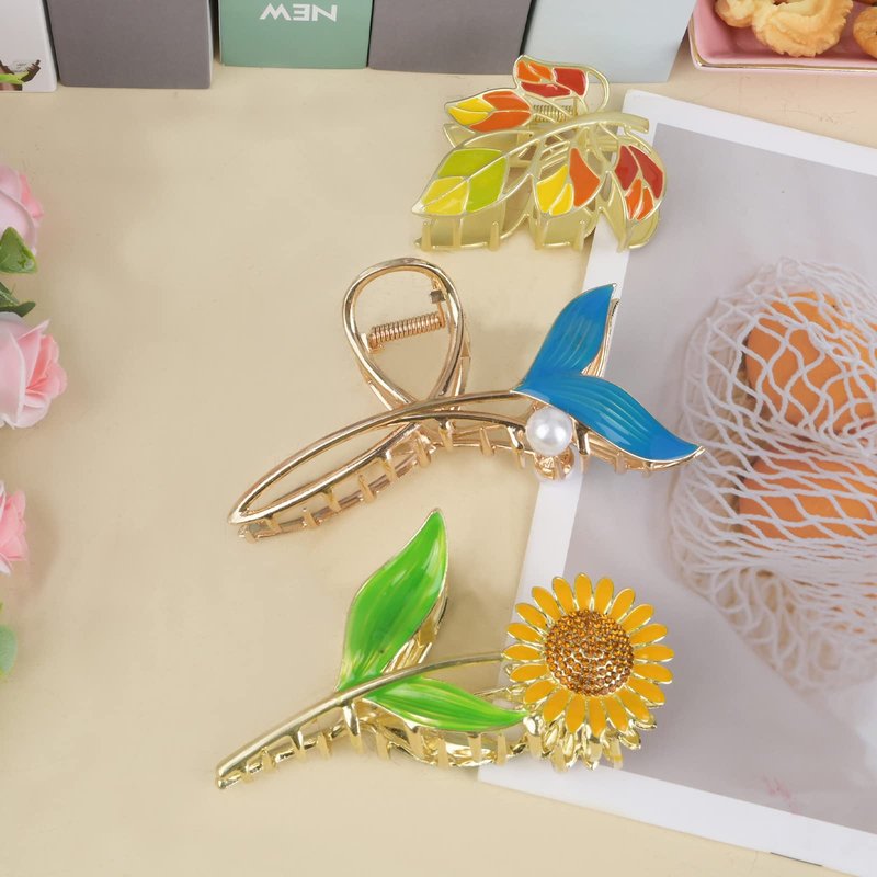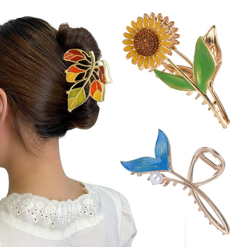 Yonchic 3-Piece Flower Metal Hair Clips, Muticolor Leaves Hair Claw for Thin/Medium Thick Hair, Elegant Sunflower Floral Barrettes Strong Hold Clamps Non-Slip Cute Fish Tail Claws Accessories