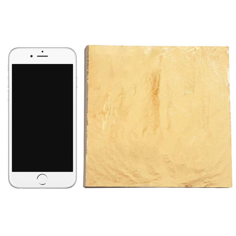 - √100 pieces 14cm x 14cm gold foil, made from 86% copper and 14% zinc, These imitation gold foils are loose leafed, with each sheet sandwiched between tissue-like paper sheets. To use, gently lift a tissue paper and grasp the sheet underneath it. The imitation gold material, whose main component is copper, is perfect for restoring furniture into beautiful new-looking gold treasures at home. It can also be used to make your crafts more resplendent.non-edible,can't be used for cake baking