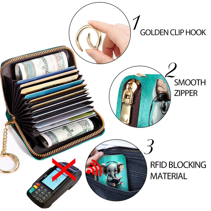 Yonlevres RFID Wallet Women Credit Card Holder, Cute Elephant Small Wallet with Keychain Zipper, Leather Credit Card Wallets Card Organizer Case RFID Blocking Accordion Gift