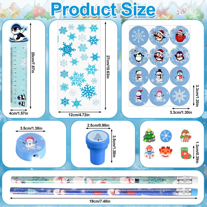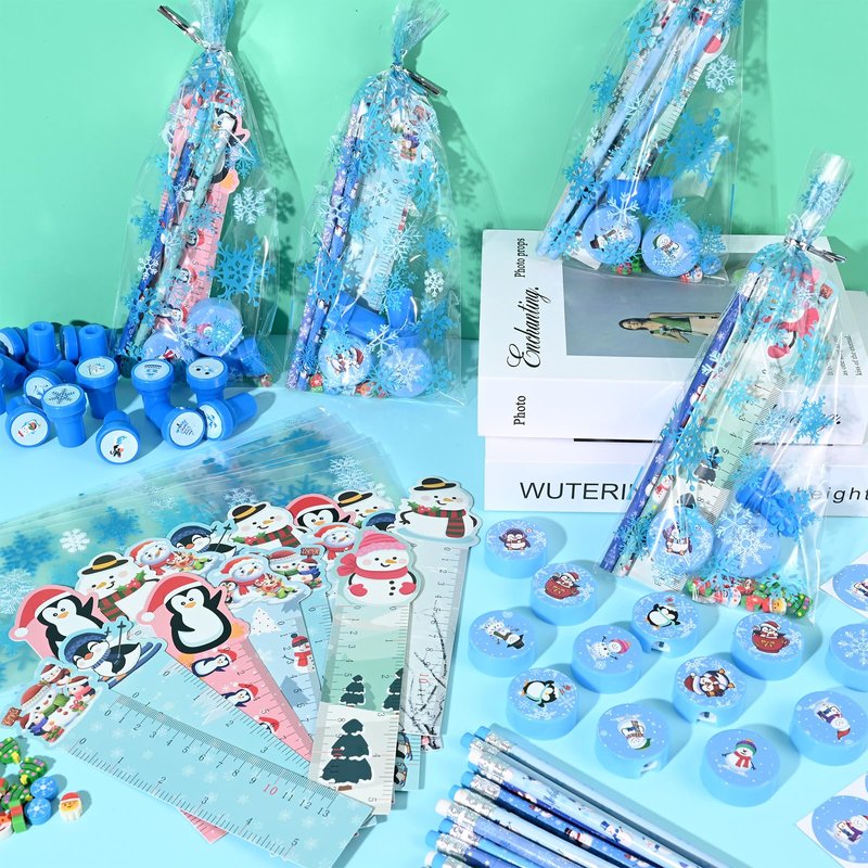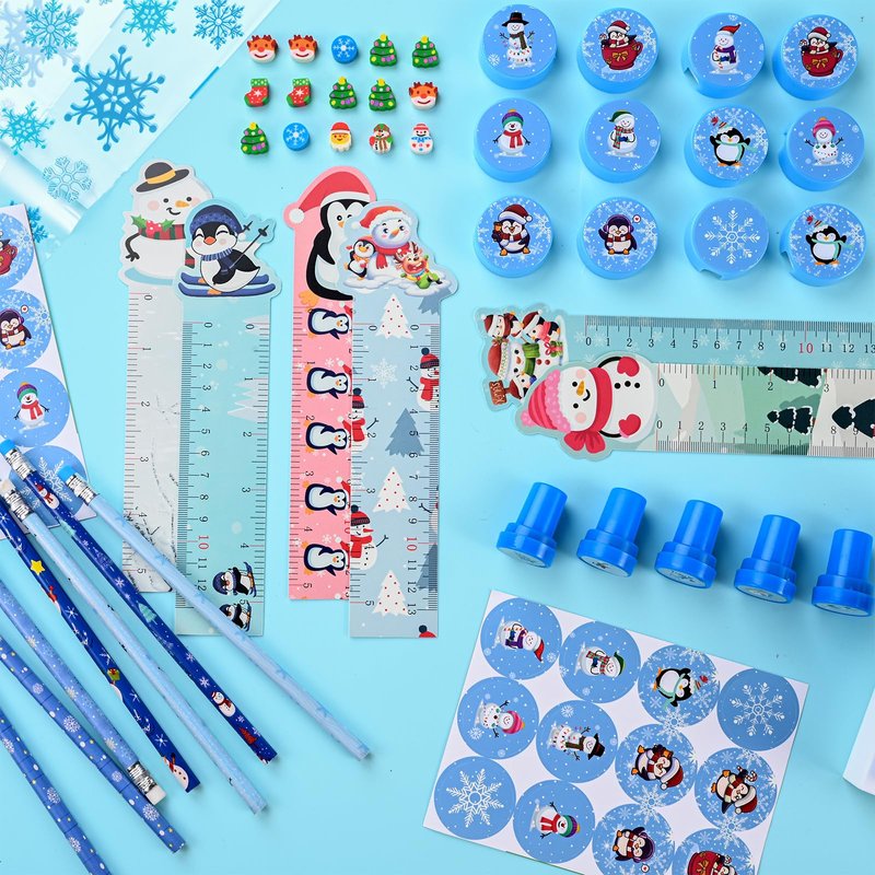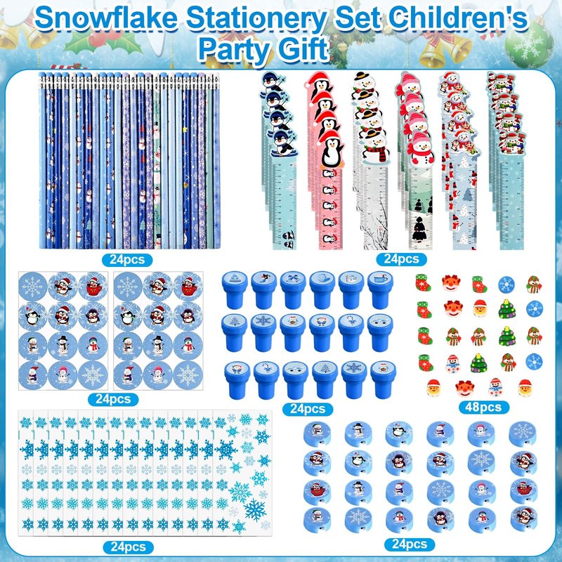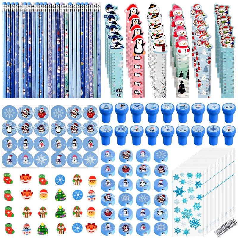- Christmas School Stationery Set: the christmas stationery set includes 24 pencils, 24 round winter stickers, 48 mini erasers, 24 rulers, 24 sharpeners, 24 stamps, 24 gift bags with twist ties, a total of 192 pieces, quantity enough to meet your party needs