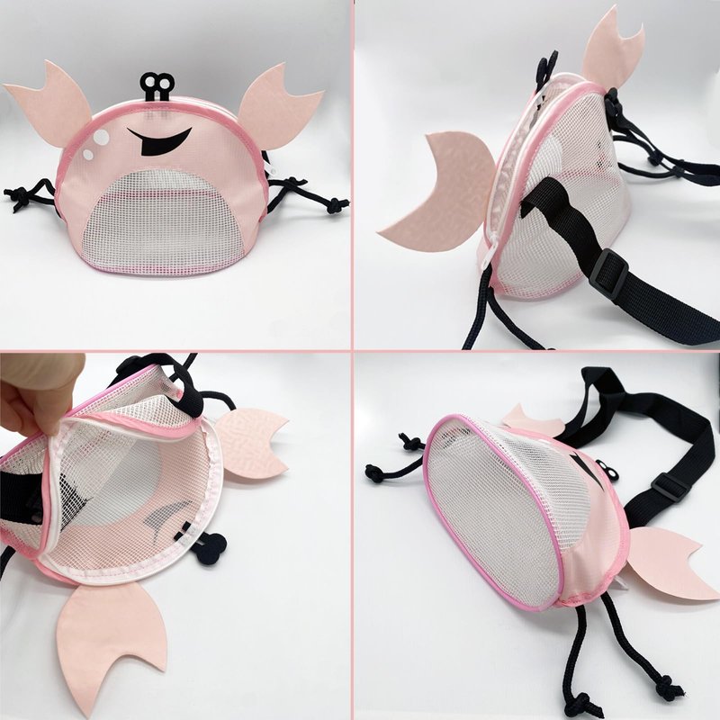 - 3☀️【Bag Details】Our cute Crab shape bag is made of tough PVC mesh material, partly made of Oxford fabric, zipper design so that the shell will not fall out when you run, and the shoulder strap is adjustable to suit all heights.