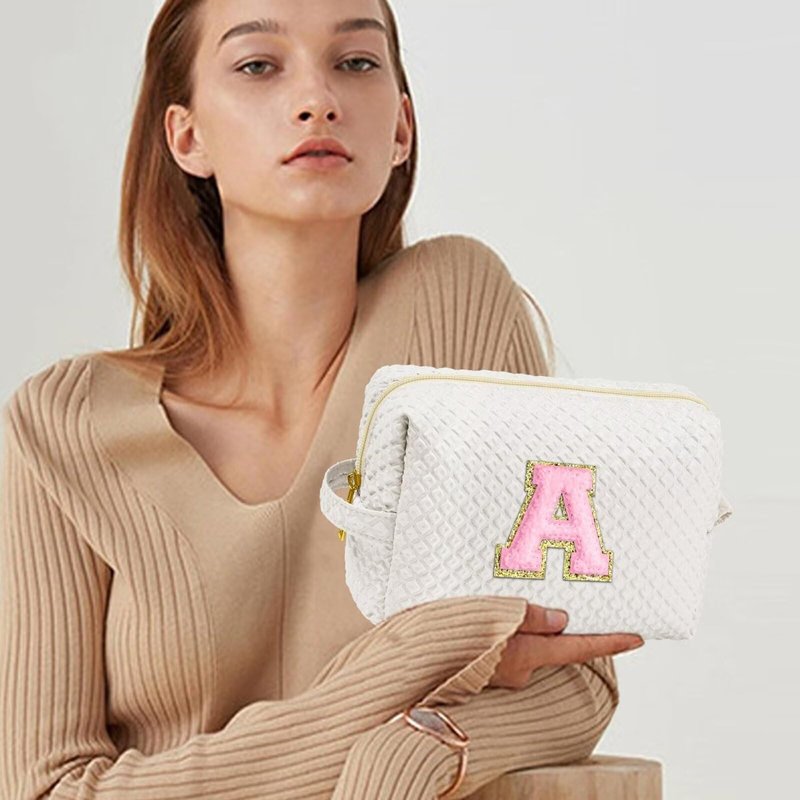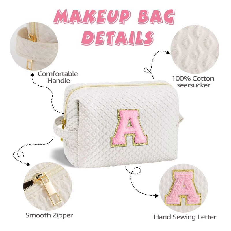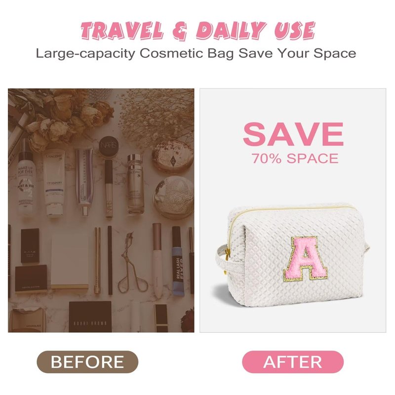 - PERSONALIZED INITIAL PATCH DESIGN: The letters on this makeup bag are hand-stitched with cotton terry towel embroidery, which is not only not easy to come off, but also comfortable to touch.