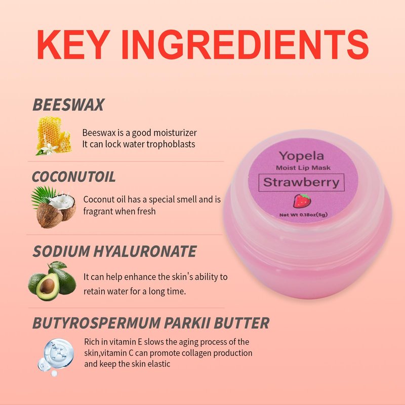 - Safe ingredients -Our lip mask is rich in Beeswax Coconut Oil Sodium Hyaluronate Hydroxy Stearic Acid Butyrospermum Parkii Butter Contains vitamin C and vitamin E These ingredients are extracted naturally and can be safely used