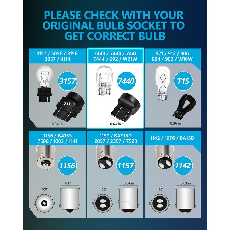 - 【NOTE】 - Normally different LED bulbs are required for different parts of the same car (I.e. brake light, tail light, turn signal light, etc.). Although 7440 LED bulbs are most commonly used, they may not fit all parts of your car. Please check owner's manual to verify compatibility before purchase or send us a picture of your original bulb for our assistance on selecting the right product