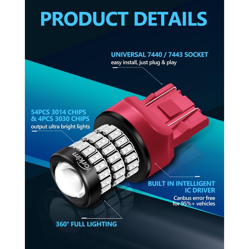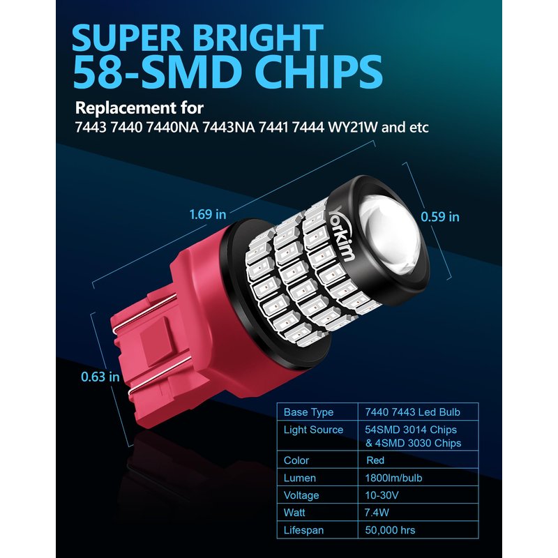 - 【ULTRA BRIGHT】 – Yorkim 7440 LED Bulbs Red comes with 2 pcs of high quality LED bulbs each designed with 54pcs 3014 & 4pcs 3030 chips radially mounted around the bulb to create a wide 360° viewing angle for better, brighter, allover light emission. 400% brighter than original halogen bulbs