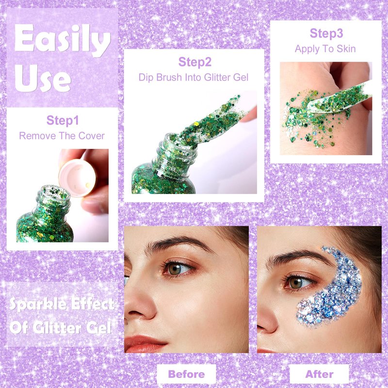 - 【Large Capacity and User-Easily】Our face glitter gel set include a 30ml makeup glitter gel, each set offering a unique color glitter, allowing you to enjoy sparkle and explore diverse hues. Specifically designed for women, our mermaid glitter gel boasts a captivating, fairy-like sparkle effect. Just dispense a suitable amount of hair glitter gel onto the skin. And a gentle rinse with warm water will effortlessly erase the sparkle, leaving your skin clean and refreshed.